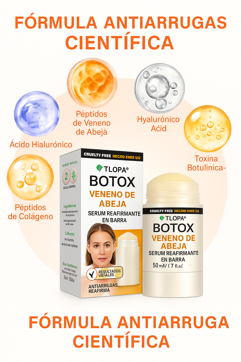 Experimente los beneficios delSuero Reafirmante en Barra TLOPA® Botox con Veneno de Abeja, quemejora el tono de la piel, aumenta la elasticidad y reduce la celulitis.Los ingredientes naturales cuidadosamente seleccionados de esta fórmula favorecen la regeneración celular, la hidratación y una mayor elasticidad, a la vez que promueven una mejor circulación. Gracias a su consistencia ligera,la crema se absorbe fácilmente en la piel, llegando a las capas más profundas para aportar nutrientes esenciales que contribuyen a una apariencia más joven y firme.