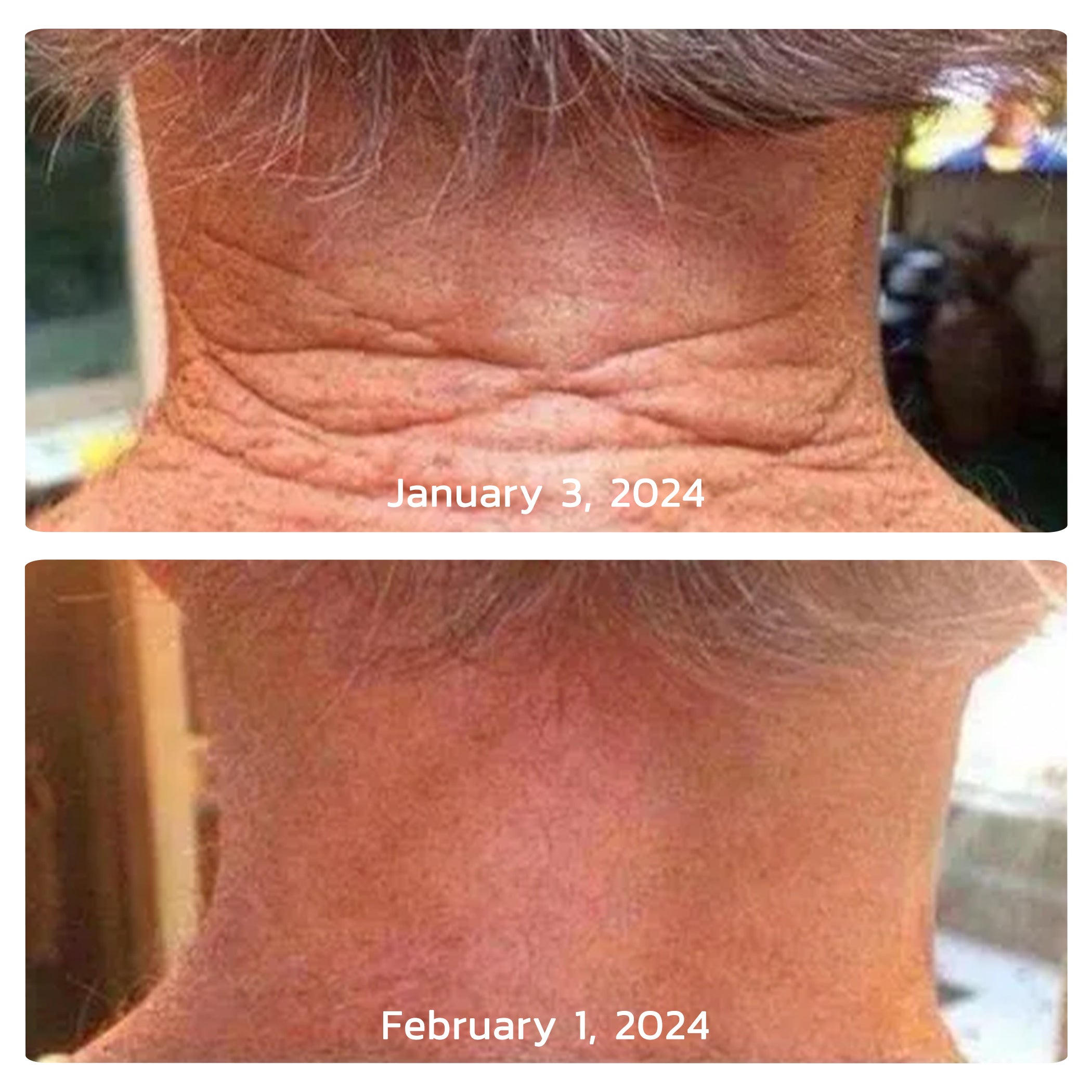"Al principio tenía algunas dudas sobre usar esta crema antiarrugas porque soy alérgica a las abejas . Contacté con atención al cliente para confirmar si era segura y me aseguraron que sí. Después de hacer una pequeña prueba en una zona sin ninguna reacción, decidí probarla. Para mi sorpresa, ¡este sérum en barra funciona de maravilla! Es el que ofrece la mejor relación calidad-precio entre todos mis productos de cuidado de la piel. La foto que tomé después de cuatro semanas muestra mi piel con un aspecto casi tan bueno como el de mis amigas, que son diez años más jóvenes. Mis arrugas se han reducido significativamente y mi piel se siente mucho más suave. Las líneas de expresión alrededor de mis labios también han disminuido, así que ya no parezco tener bigote, ¡lo cual me alegra mucho! ¡Estoy emocionada de seguir usándolo para mantener una apariencia más juvenil!"